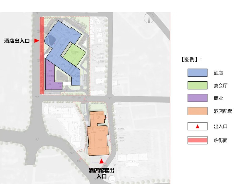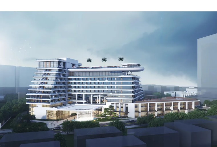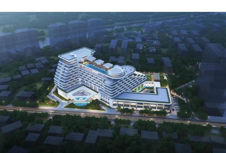 項目總用地面積約31221.96平方米,分為兩大地塊協同發力。地塊一用地21375.54平方米,總建筑面58725.45平方米,包含40613.62平方米酒店、4540.35平方米商業,配備319間酒店客房;地塊二用地9846.42平方米,總建筑面積16267.57平方米,以酒店配套功能為主。兩大地塊綠地率均達20.10%,實現建筑與自然的和諧共生。