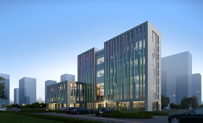 在建筑立面設計上,參考了現代高科技發展的母體——電子電路板,作為建筑立面設計的靈感源泉,通過元素提取,在立面上采用灰色、深色色彩為主的材質,并對材質進行切割,設計出整體規整、細節多變的建筑立面。
